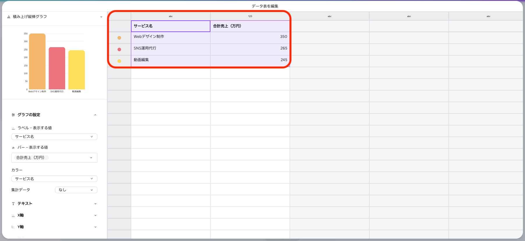 以下のデータを分析して、サービス別の3ヶ月間の「合計売上」を算出し、Canvaのグラフ機能に貼り付けられるよう「サービス名」と「合計売上(万円)」の2列の表形式で出力して。 (ここにデータを貼り付け)