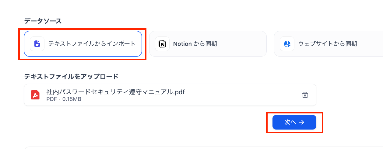 「テキストファイルからインポート」を選び、社内のFAQリストやマニュアルをアップロードしましょう。