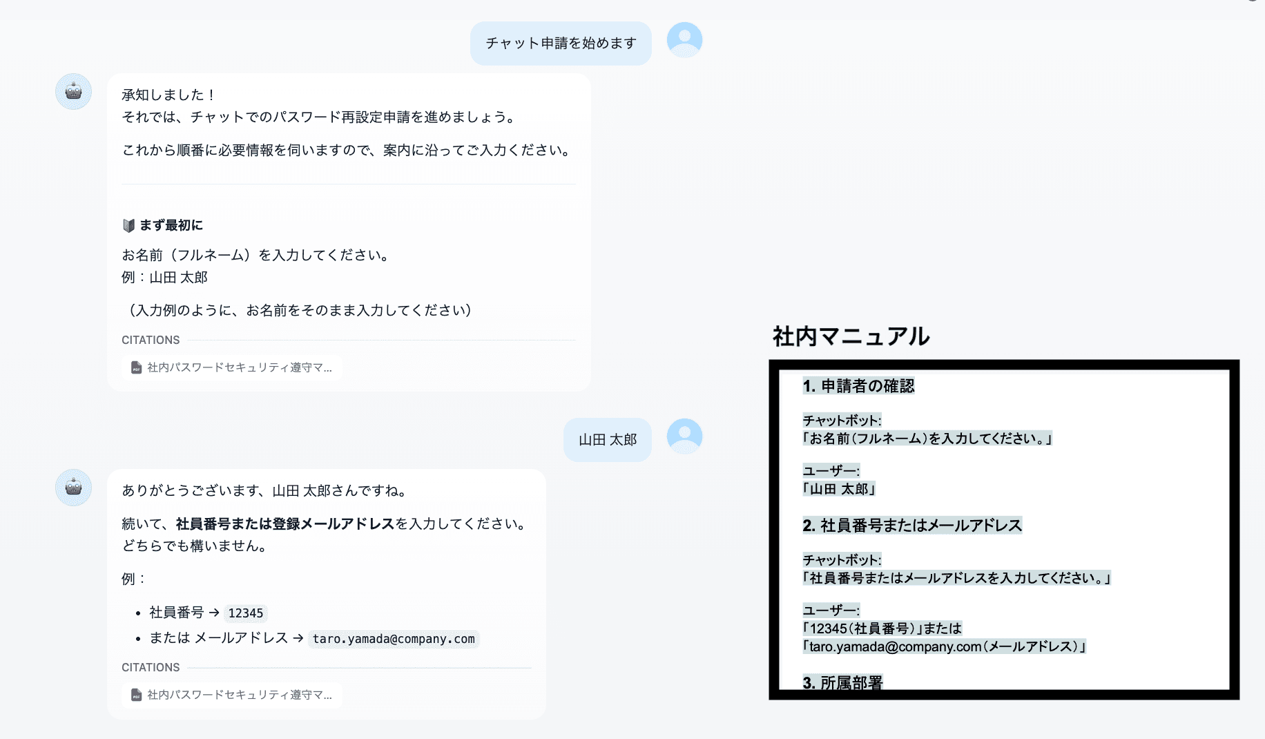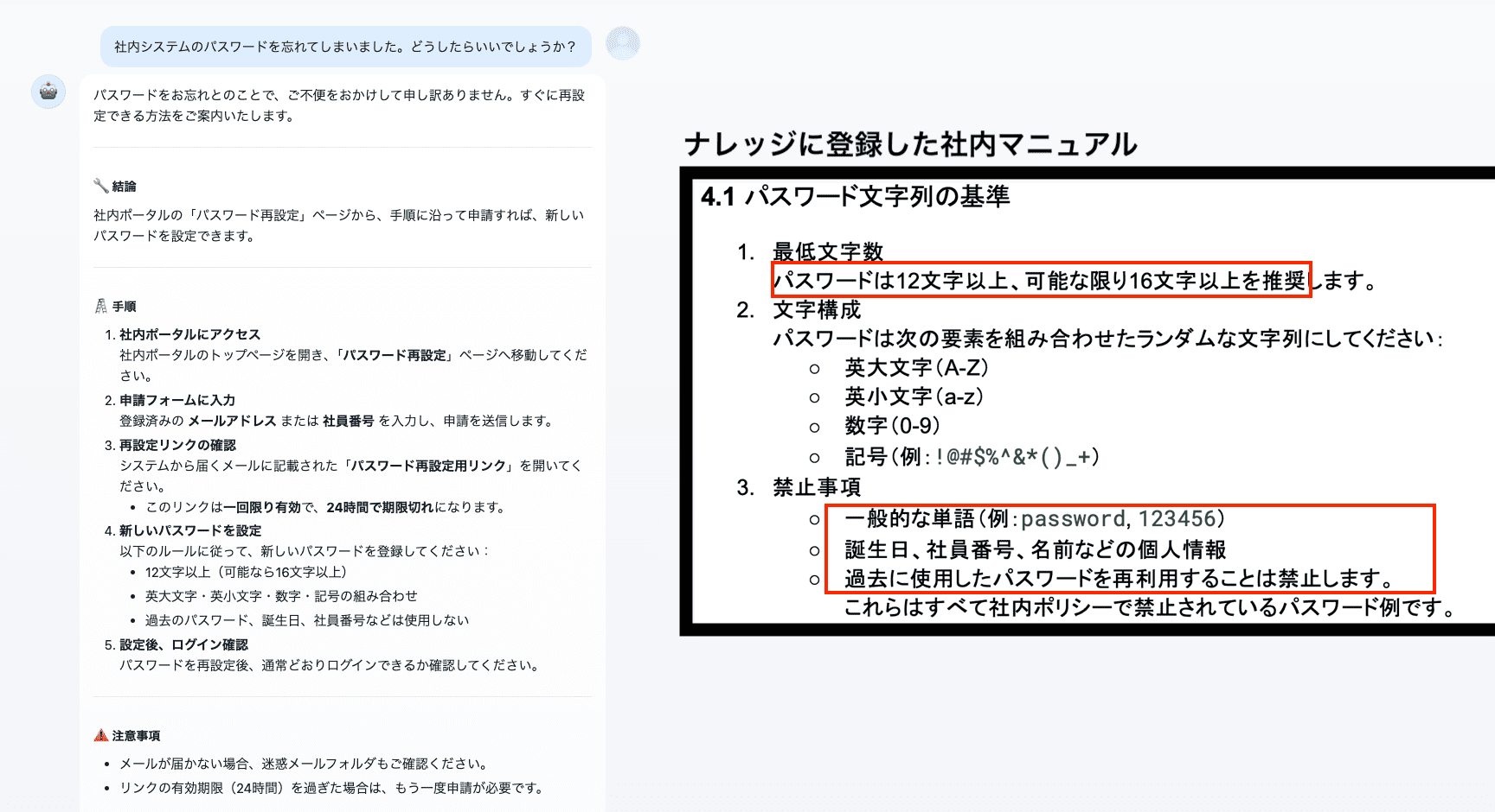 ここでは、情シス担当者が社員から寄せられる「パスワード忘れ」などの質問に対し、社内マニュアルを参照して即座に回答し、解決率を向上させることを目的としています。