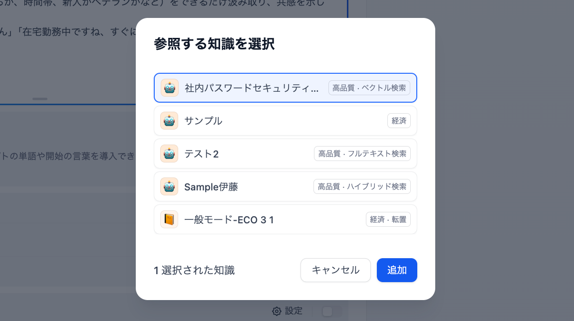 まず、独自データや専門知識の基盤となる「ナレッジ」を登録します。