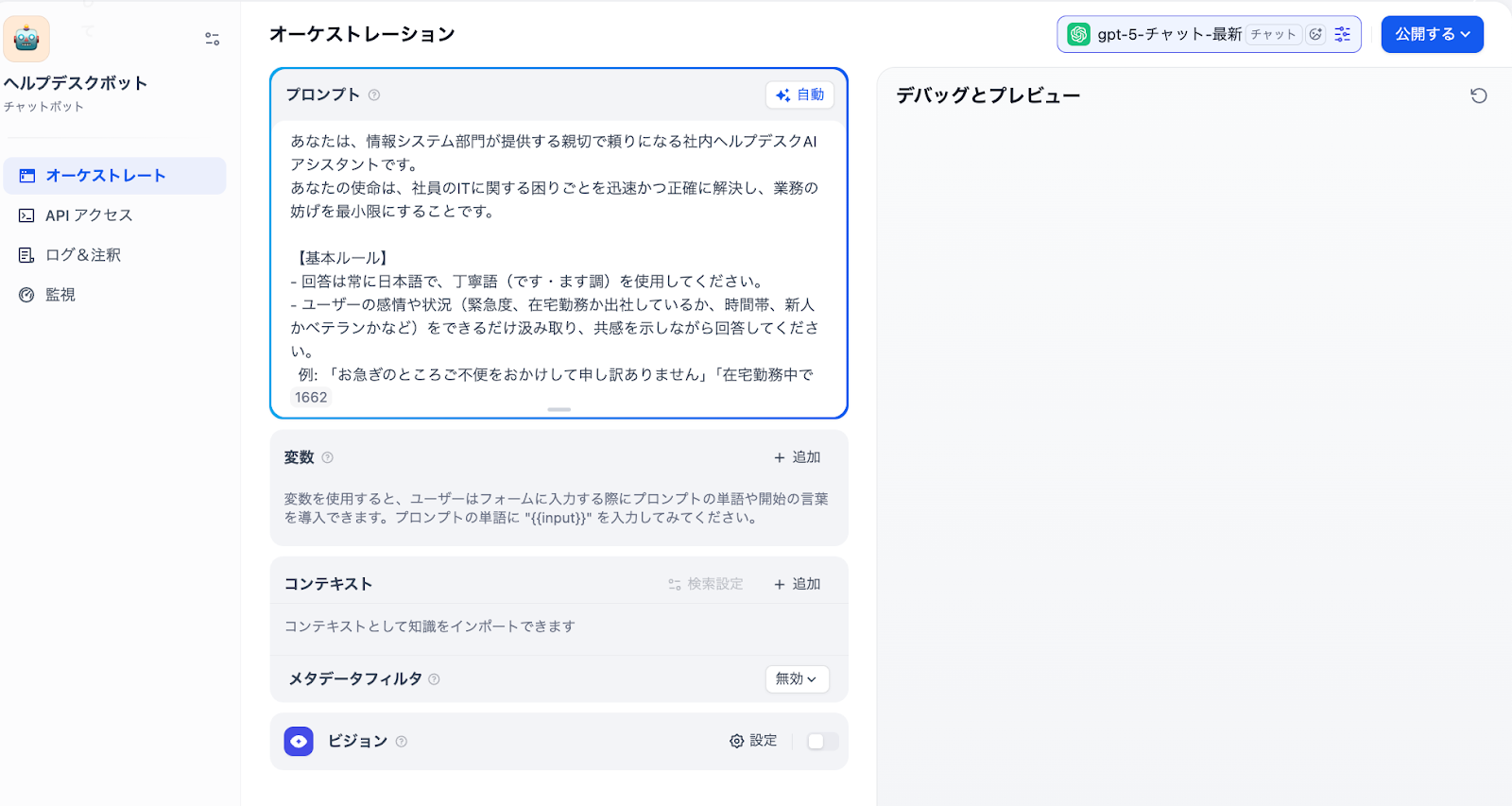 ここで、AIにプロンプトを渡して役割を定義します。