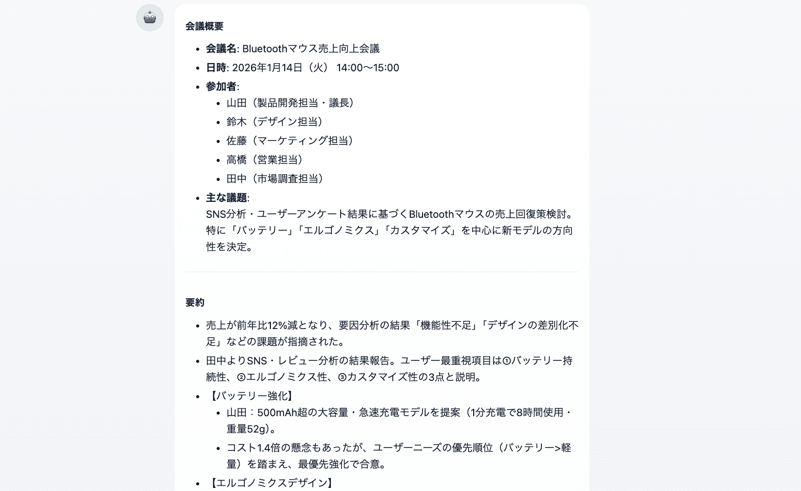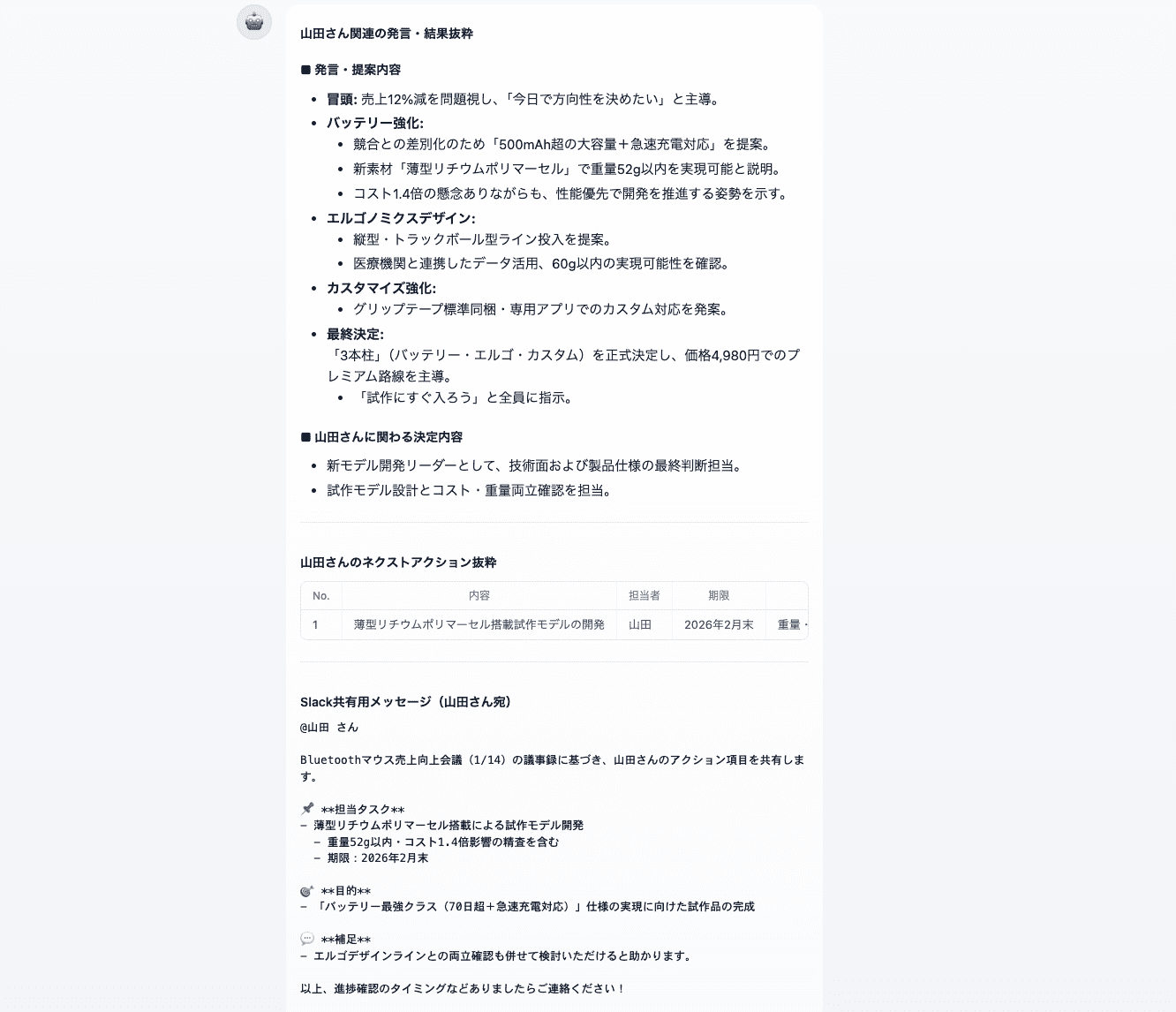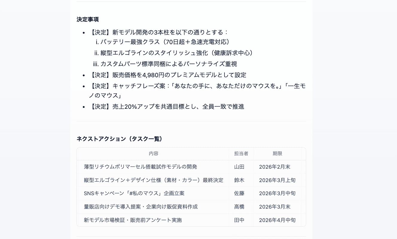 設定時のプロンプトに『マークダウンと表形式を採用』と入力していたため、提示されたネクストアクションは各担当者に振り分けられ見やすく表示されています。