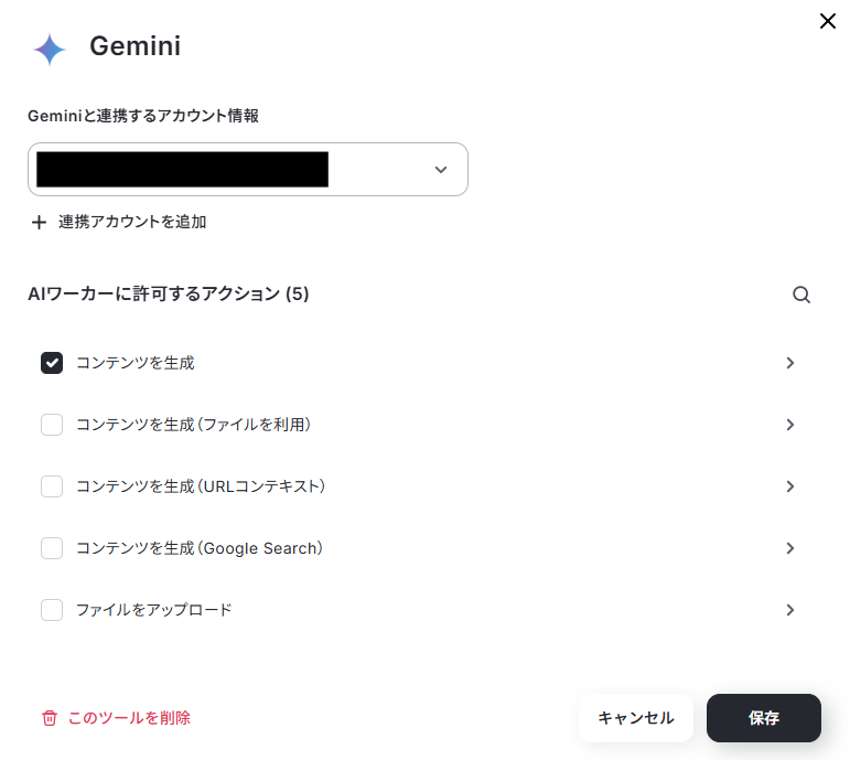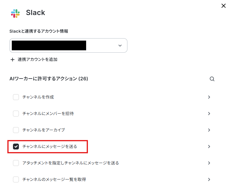 下記は、すでに1つアカウントがAIワーカーと紐づいている状態ですが「連携アカウントを追加」から別のアカウントを追加できます。