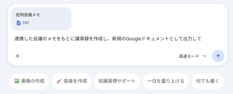 「連携した会議のメモをもとに議事録を作成し、新規のGoogleドキュメントとして出力して」と打ち込み、txt形式のメモを貼り付けて送信します。