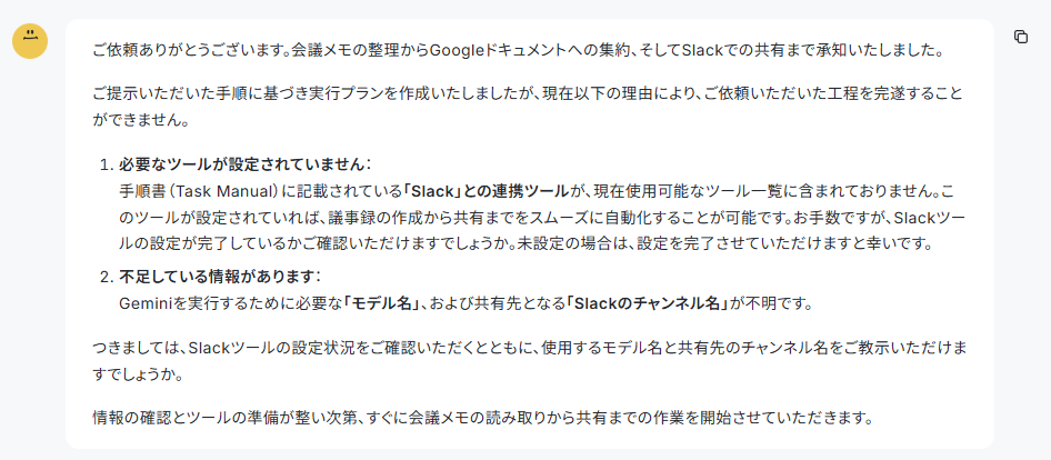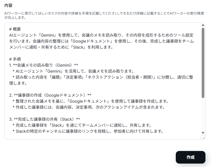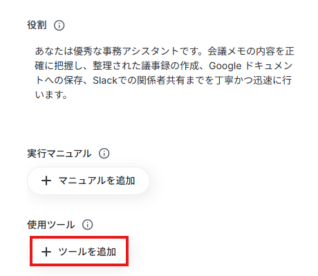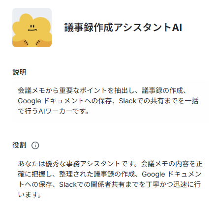 今回は「あなたは優秀な事務アシスタントです。会議メモの内容を正確に把握し、整理された議事録の作成、Google ドキュメントへの保存、Slackでの関係者共有までを丁寧かつ迅速に行います。」と定義しました。