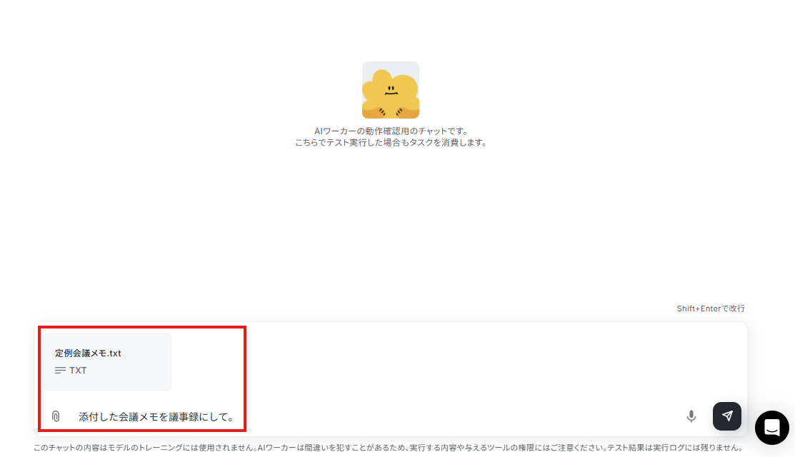 AIワーカーのチャット画面から「 添付した会議メモを議事録にして。 」と指示を送信しました。