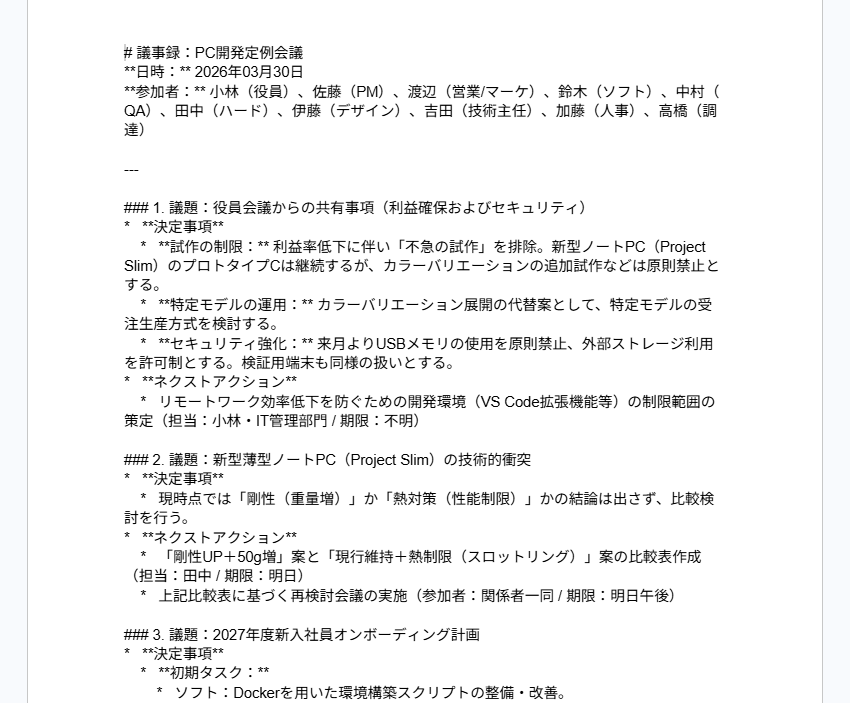 Geminiを連携させたAIエージェントを活用すれば、会議の録音データや文字起こしテキスト、あるいは担当者が書き留めた雑多な箇条書きのメモをベースにして、構造化された分かりやすい議事録を自動生成できます。