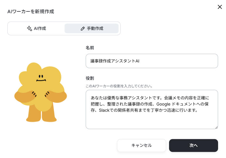 今回は議事録作成のサポートを目的とするため、AIワーカーの名前を「議事録作成アシスタントAI」としました。