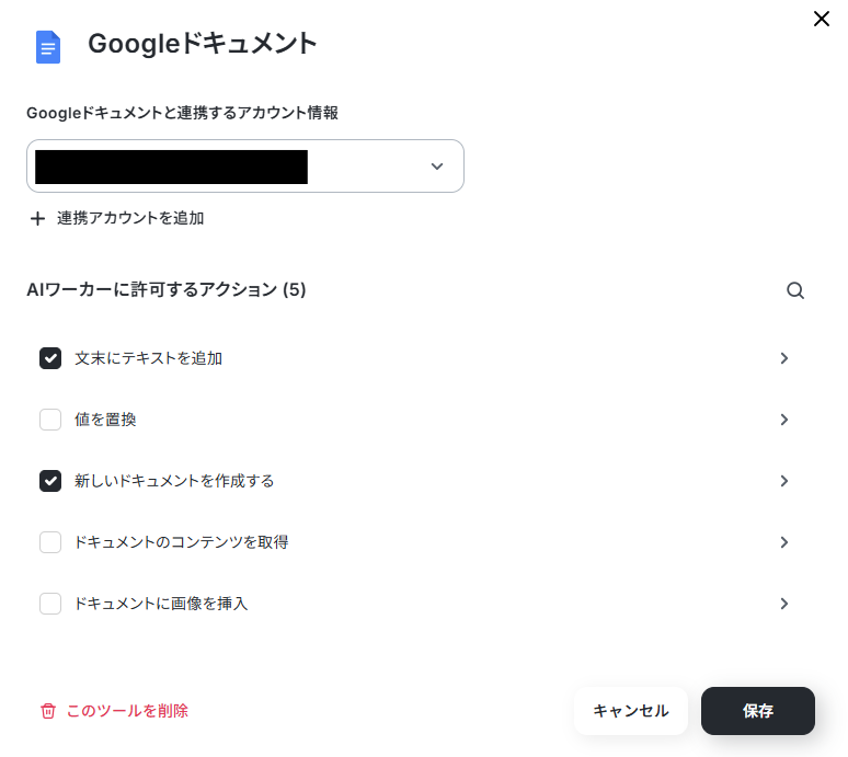 連携するアカウント情報を設定したら、今回は文末にテキストの追加と、新しいドキュメントを作成するを選択します。