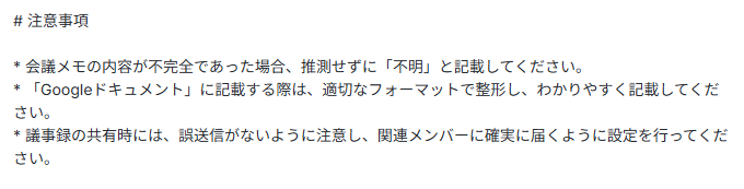 特に、間違った情報で議事録をまとめないよう、不明点がある場合は勝手に推測して進めないように指示しています。