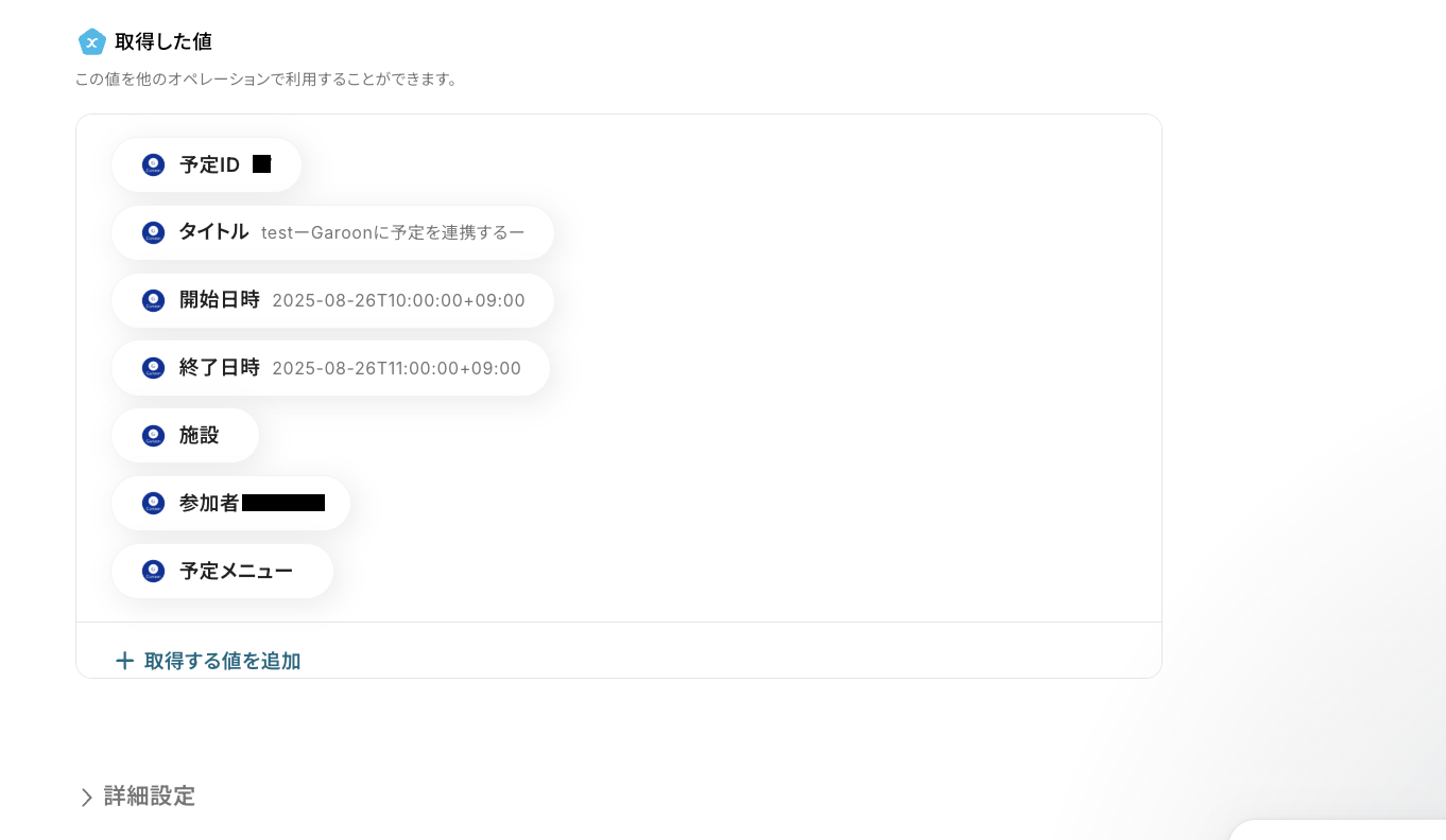 テストに成功すると、『取得した値』の項目に情報が表示されます。この値は後続のオペレーションで変数として活用できます。