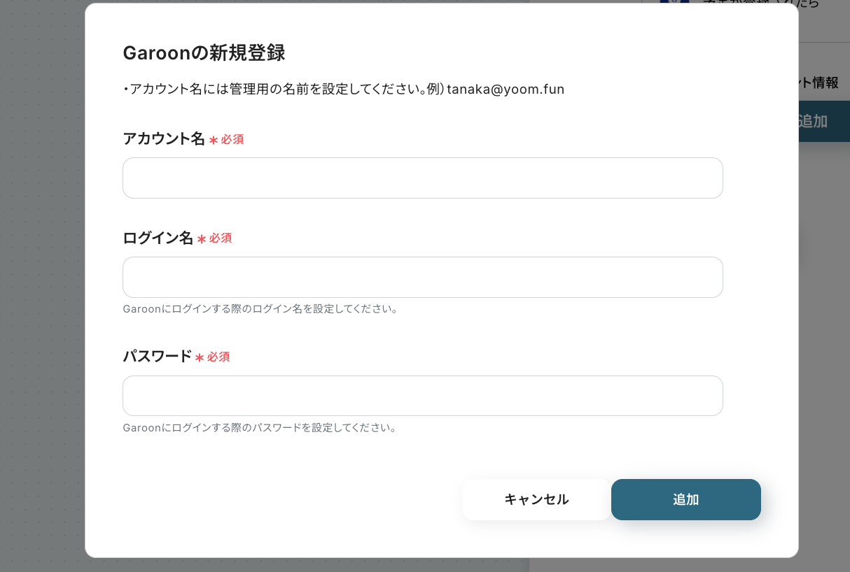 「アカウント名」と「ログイン名」、「パスワード」を注釈に沿って確認して情報を入力してください。「追加」を押下すると、登録が完了します。