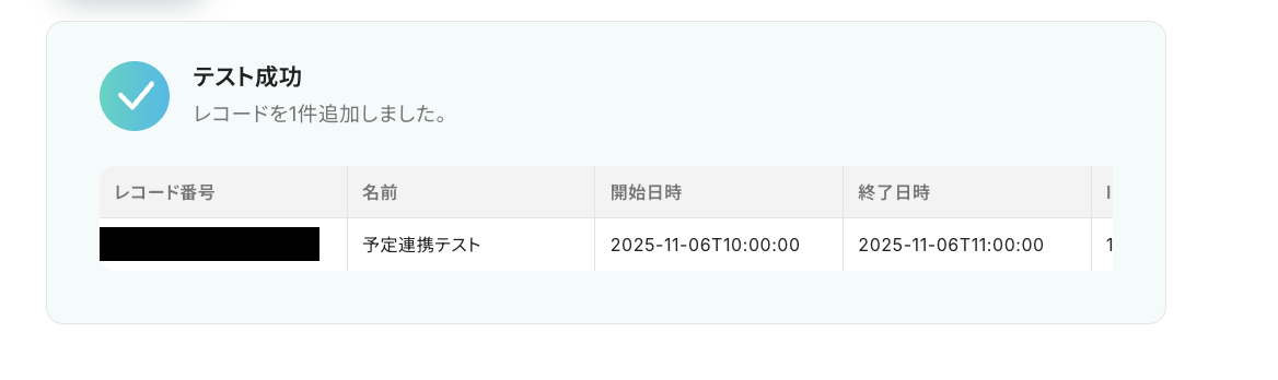 設定後、「テスト」を押して実際にkintoneに情報が反映されるか確認します。(テスト成功は以下のように表示されます。)