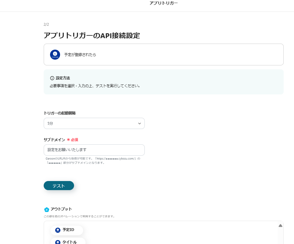 実際にGaroonでテスト用の予定を登録し、Yoomで「テスト」をクリックしてください。