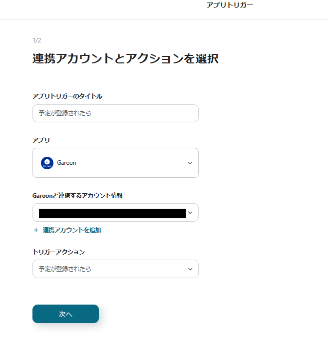 タイトルと連携するアカウント情報を任意で設定し、トリガーアクションはテンプレート通りに「予定が登録されたら」のまま「次へ」をクリックして進んでください。