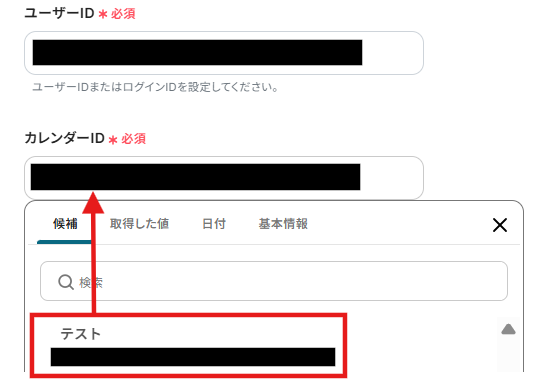 ユーザーIDおよびカレンダーIDはアプリと連携できていれば、候補から選択することが可能です。