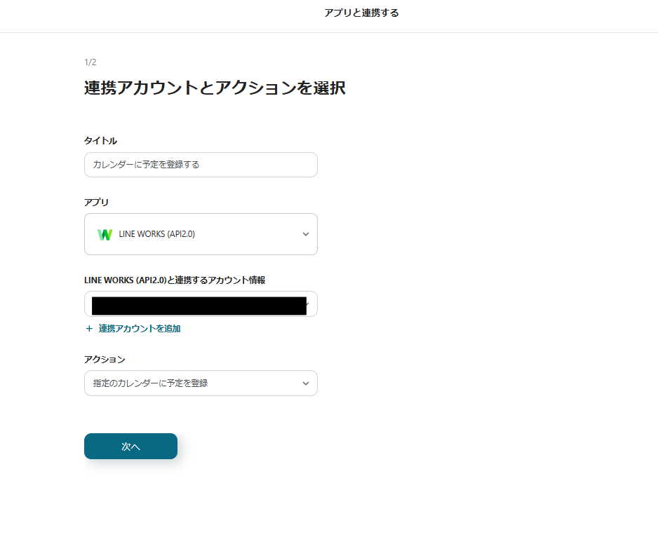 先ほどと同様に、タイトルと連携するアカウント情報を任意で設定し、アクションはテンプレート通りに「カレンダーに予定を登録する」のまま「次へ」をクリックして進んでください。