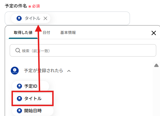 また、予定の件名や予定の開始時刻などは、入力欄をクリックし、Garoonのアウトプット情報を選択できるので、埋め込みながら入力してください。