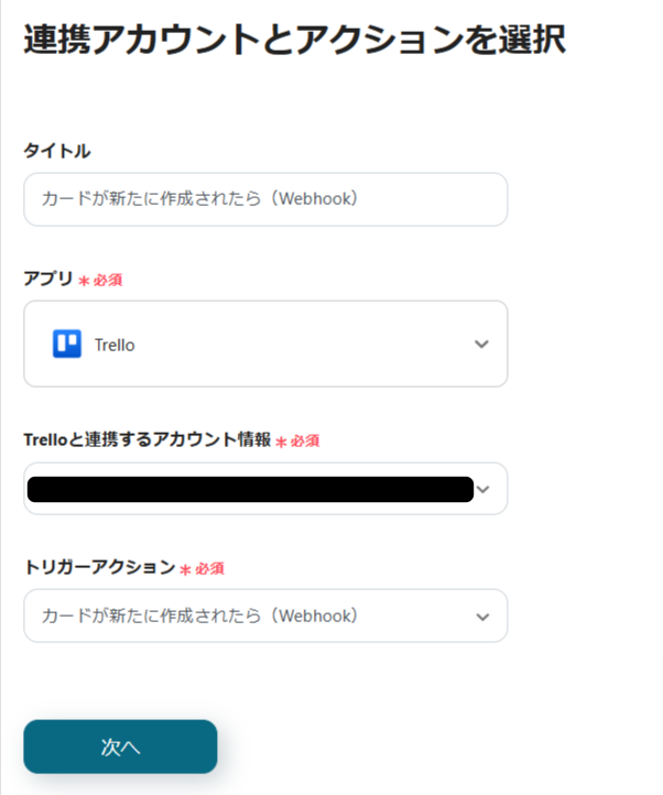 最初の設定は「カードが新たに作成されたら」です。Trelloでカードが新規作成されたらフローが動くように設定してみましょう。