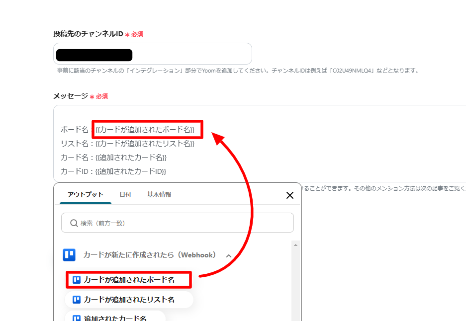 アウトプットが入力された部分は、取得したTrelloの情報によってメッセージ内容が変化します。