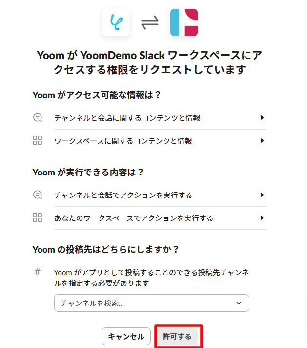 ログインをして、Yoomと連携したいワークスペースへのアクセスを許可してください。