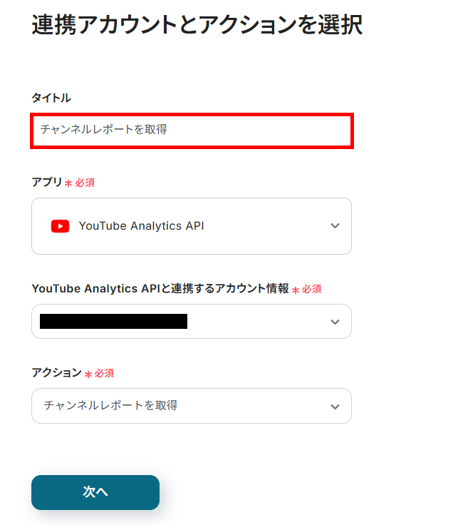 ステップ3:YouTubeのチャンネルレポートを取得するアクションを設定