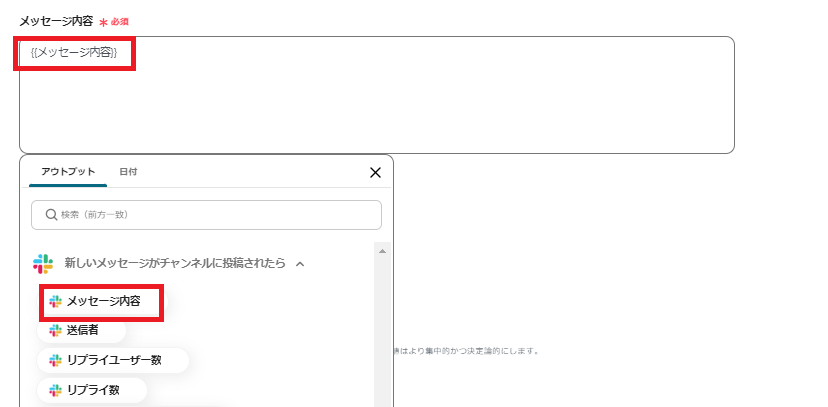 メッセージ内容:クリックし、アウトプットにある新しいメッセージがチャンネルに投稿されたら」の中の「メッセージ内容」を選択してください。