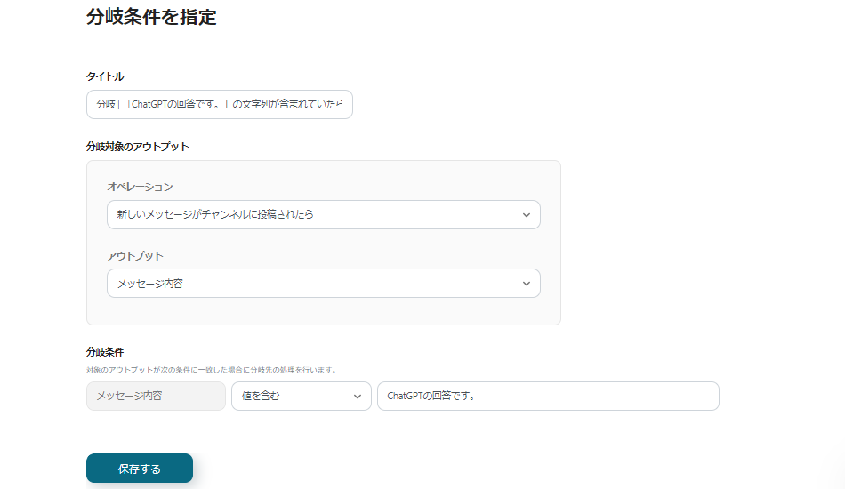 分岐条件:「値を含む」を選択し、「ChatGPTの回答です。」と入力してください。