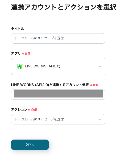 タイトルの任意編集とアカウント情報の確認を行い「次へ」をクリックして先に進みます。