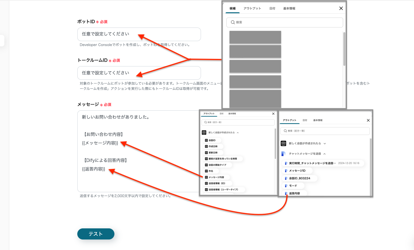 全て設定し終えたら「テスト」をクリックし、指定したトークルームにメッセージが送信されるか確認しましょう。