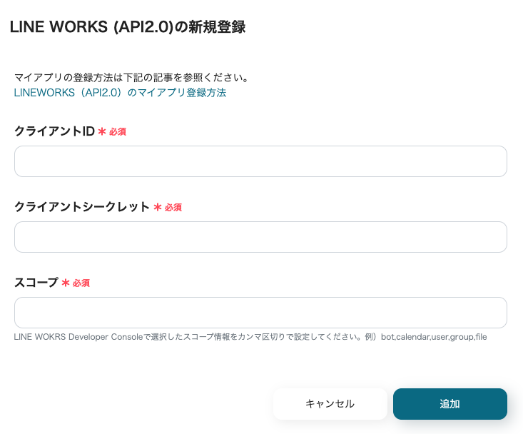 クライアントID、クライアントシークレット、スコープを入力後、「追加」をクリックしてマイアプリ連携を完了しましょう。