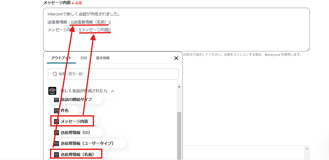 今回は、Intercomに新しく会話が作成されたら、「送信者情報(名前)」と「メッセージ内容」を自動で取得し、Discordのメッセージ内容に転記されるように設定してみました。