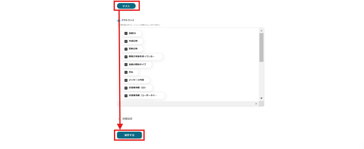 先ほど作成したIntercomの会話の情報がアウトプットに表示されるので、誤りが無いか確認し設定を保存しましょう。