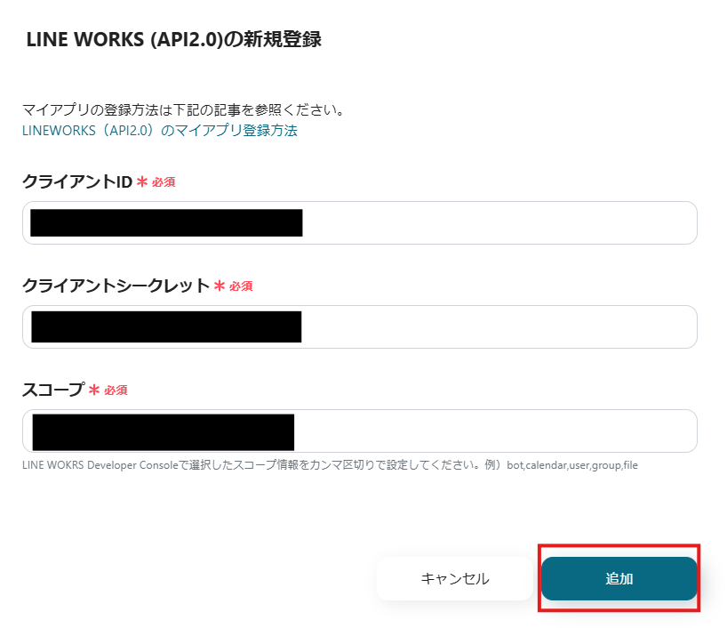 次の画面で、必須項目を入力し、「追加」をクリックします。