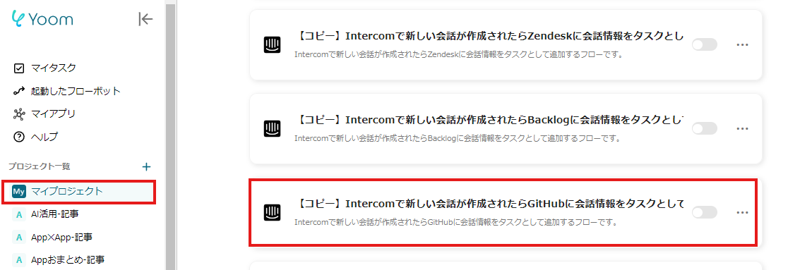 テンプレートをコピーしたら、事前準備としてIntercomとGitHubをYoomのマイアプリに登録します。