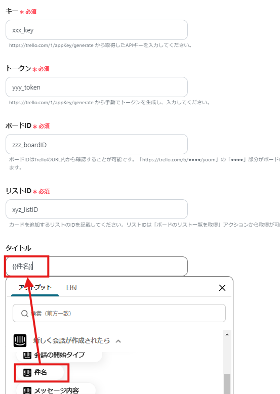 「キー」「トークン」「ボードID」「リストID」は必須項目になっているので、必ず入力してください。
