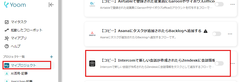 テンプレートをコピーしたら、事前準備としてIntercomとZendeskをYoomのマイアプリに登録します。