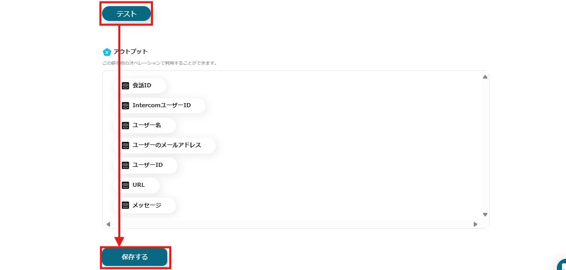 テストが成功したら、先ほどIntercomで作成した会話の情報がアウトプットに表示されます。