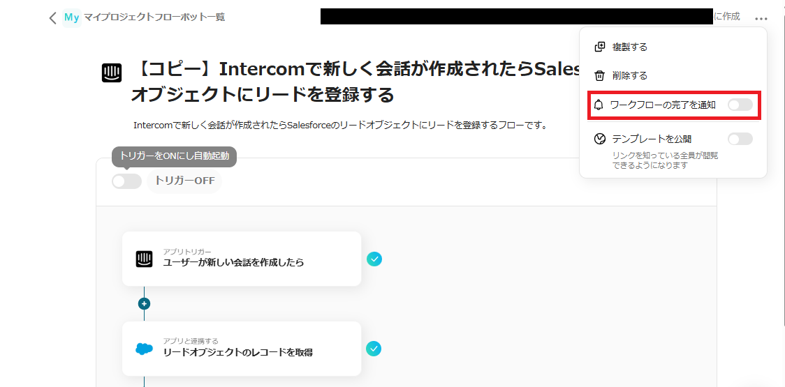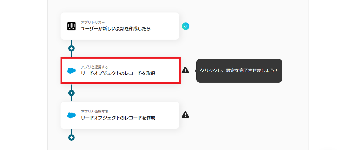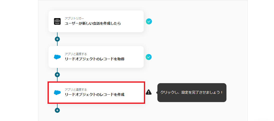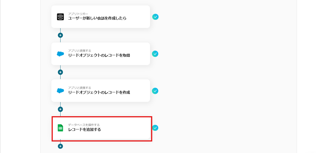 これで「Intercomで新しく会話が作成されたらSalesforceのリードオブジェクトにリードを登録する」フローの完成です。
