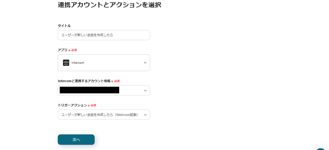 このように設定することで、Intercomで新しく会話が作成されたら「名」を取得し