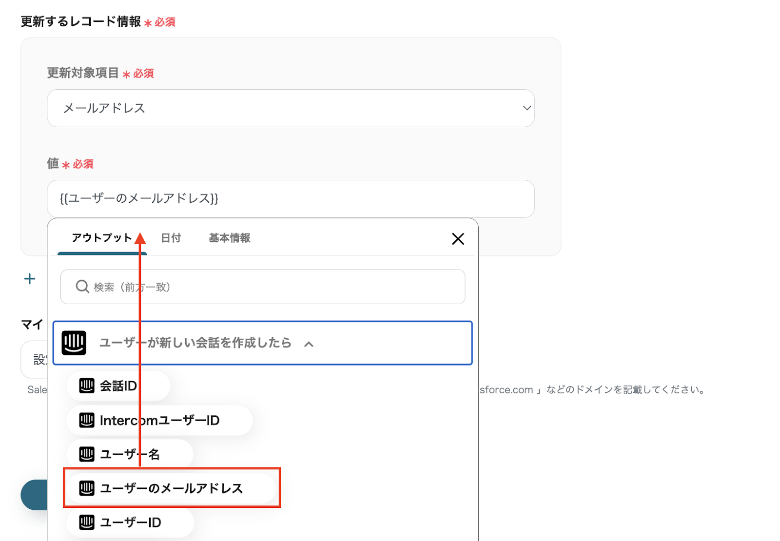 (8)今回のフローでは、更新するレコード情報として「更新対象項目」をメールアドレス(プルダウンから選択)に指定し、「値」を1つ目のステップで取得した【ユーザーのメールアドレス】を引用します。