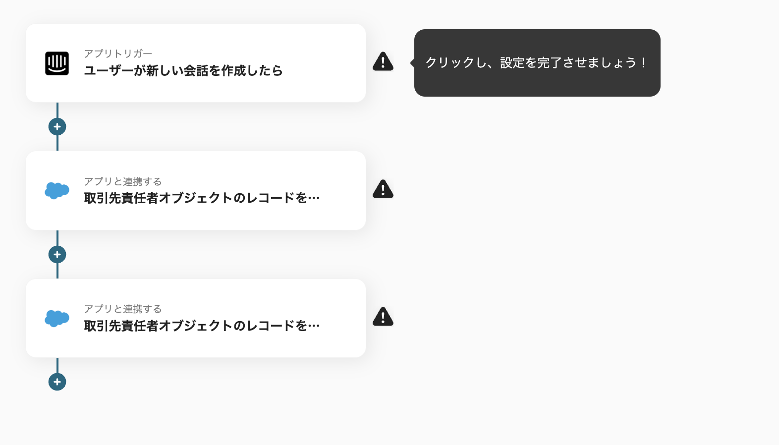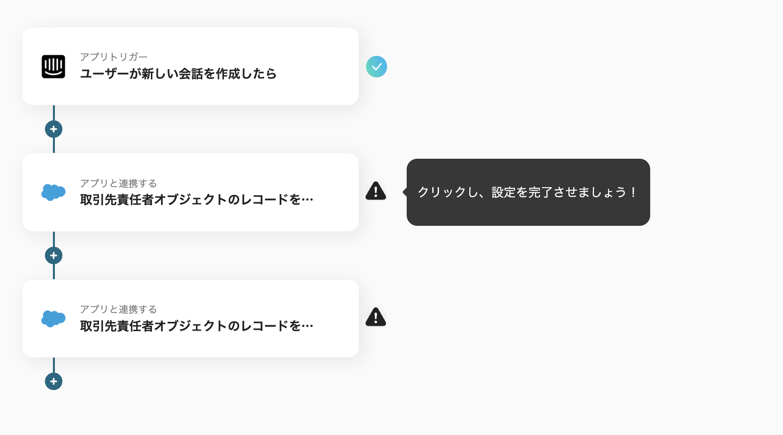 ※Salesforceはチームプラン・サクセスプランでのみご利用いただけるアプリとなっております。フリープラン・ミニプランの場合は設定しているフローボットのオペレーションやデータコネクトはエラーとなりますので、ご注意ください。
