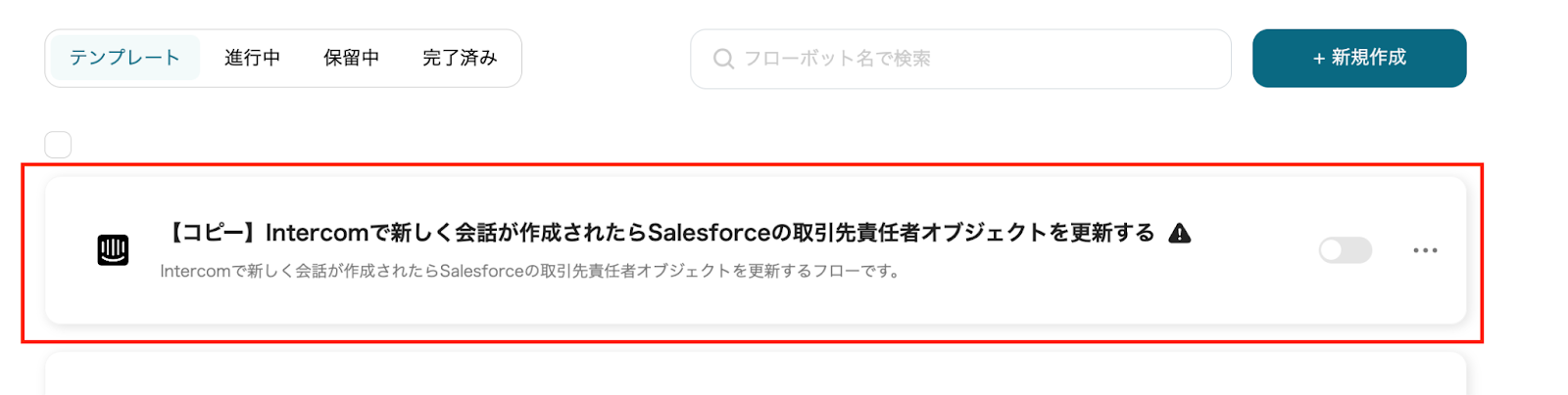 では、「Intercomで新しく会話が作成されたらSalesforceの取引先責任者オブジェクトを更新する」のテンプレートを使ったフローボットを作成していきましょう。
