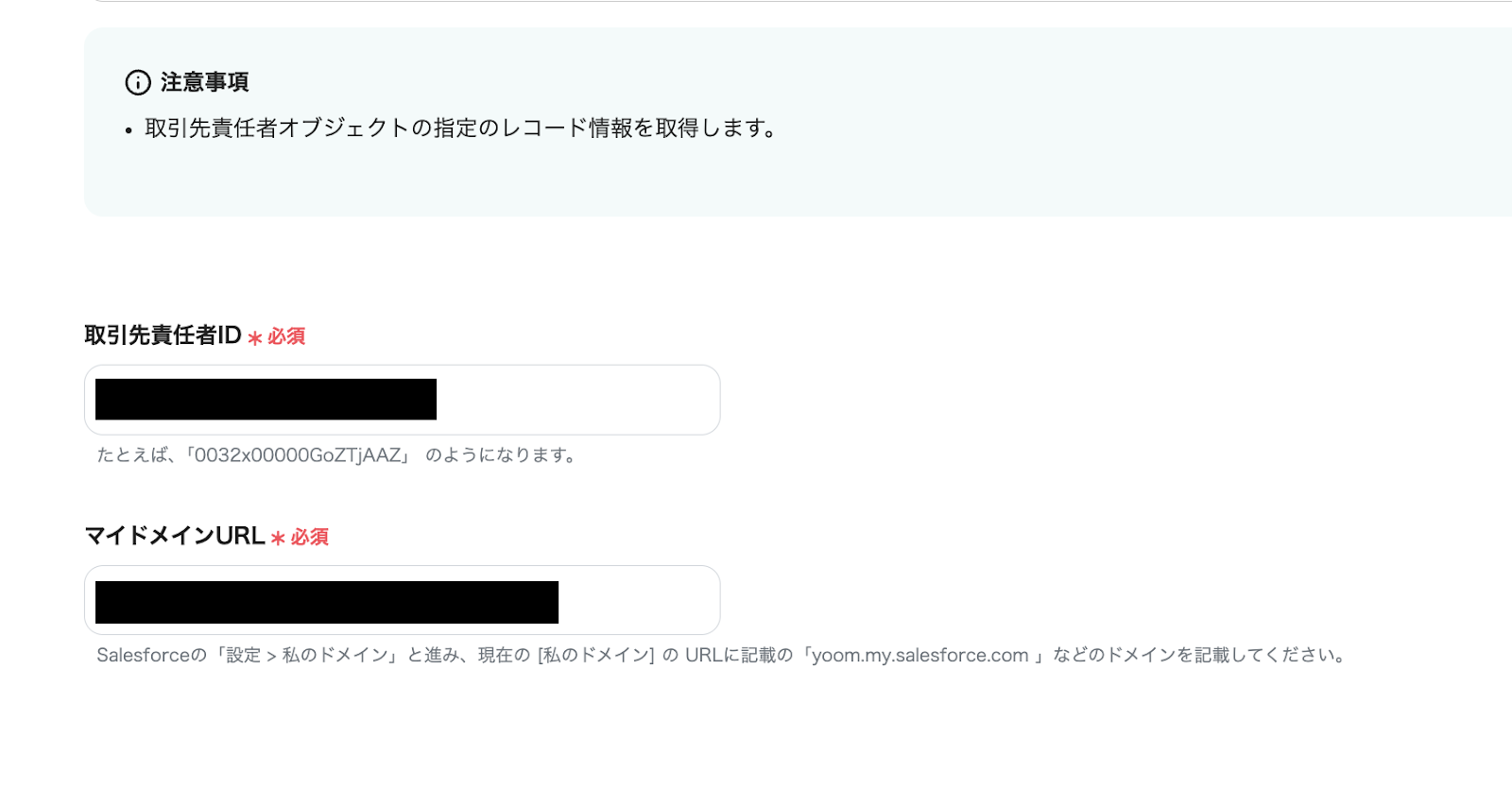 (3)次の画面で「取引先責任者ID」と「マイドメインURL」の項目に、注釈に沿って情報を入力します。