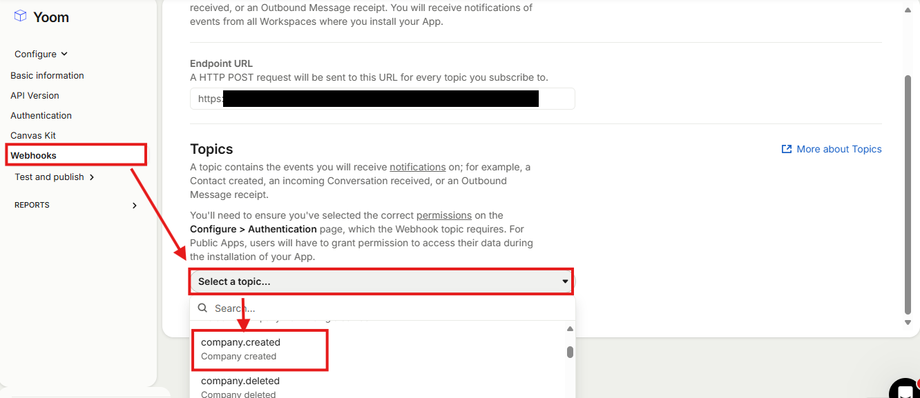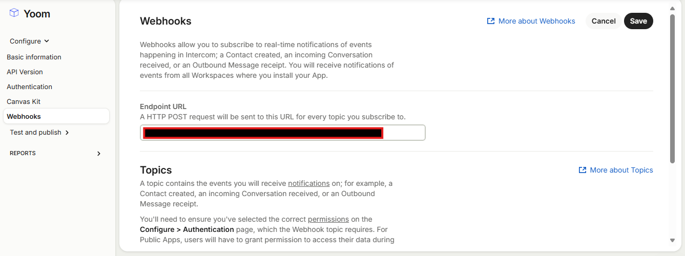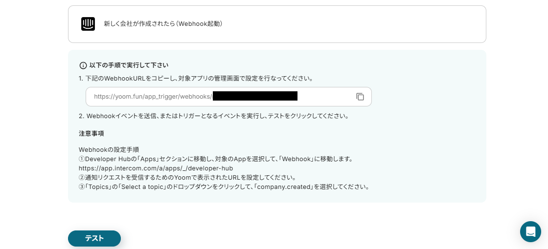 ・IntercomのWebhookの設定方法は下記をご参照ください。