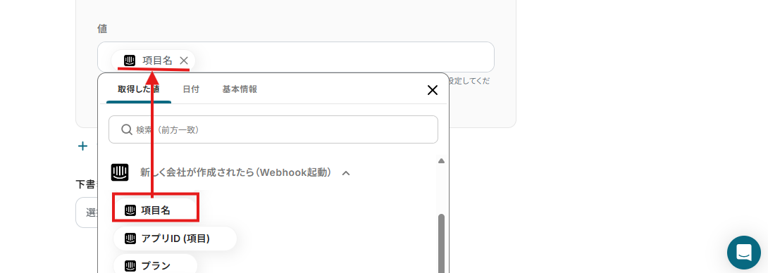 値には、フィールドに自動登録したいIntercomのデータの内容を入力します。