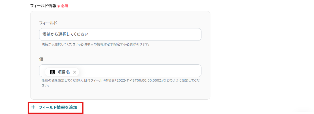 他にも自動取得したい項目があれば「+フィールド情報を追加」をクリックすることで設定可能です。