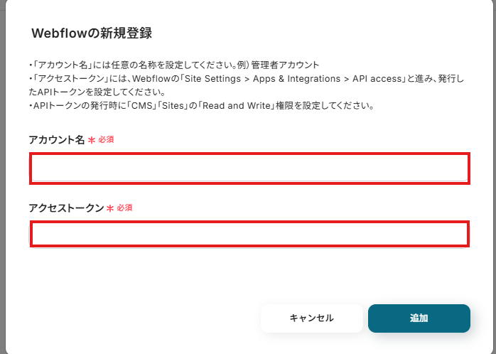 アカウント名とアクセストークンを入力したら「追加」ボタンをクリックします。