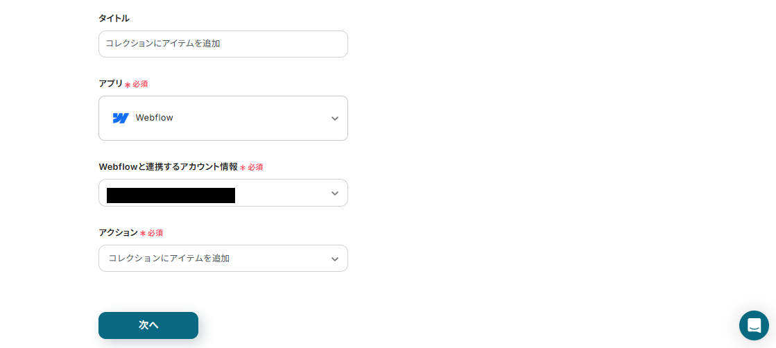 次にWebflowのアクションを設定して、IntercomのデータをWebflowのコレクションに自動で反映させるための設定を行います。