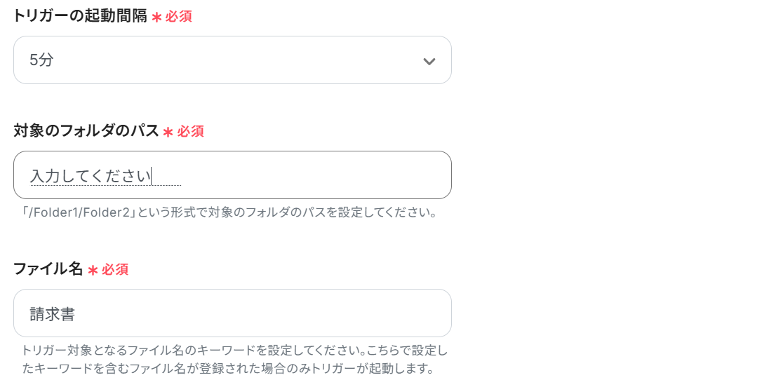 ファイル名:ここで設定したキーワードが含まれるファイルの場合にトリガーが起動します。
